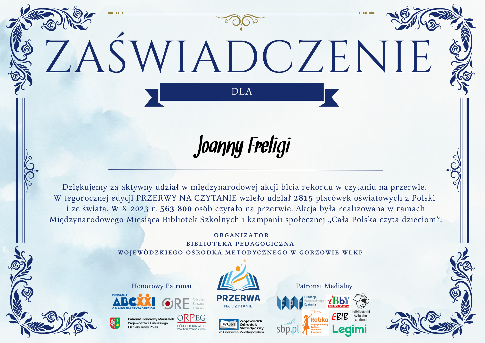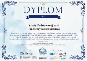 Z przyjemnością informujemy, że po raz kolejny otrzymaliśmy dyplom za udział w edycji międzynarodowej „Przerwy na czytanie”.
