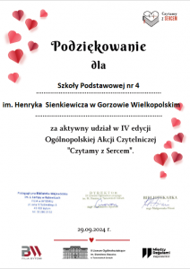 Na początku roku szkolnego 2024/2025 biblioteka szkolna brała udział w ogólnopolskiej akcji czytelniczej „Czytamy z sercem”, która była bezpłatna inicjatywą czytelniczą i edukacyjną organizowaną w ramach obchodów dwóch świąt odbywających się 29 września – Ogólnopolskiego Dnia Głośnego Czytania oraz Światowego Dnia Serca. Uczniowie uczestniczyli w różnorodnych aktywnościach związanych z kształtowaniem świadomości prozdrowotnej.
