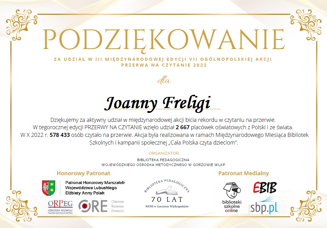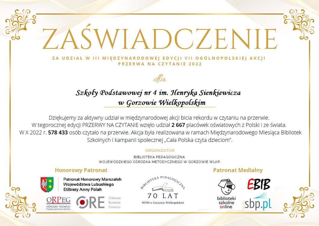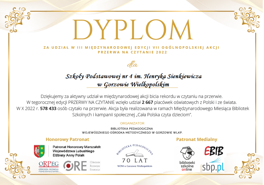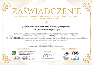 Sprawozdanie z realizacji projektu czytelniczego realizowanego w bibliotece i świetlicy Szkoły Podstawowej nr 4 im. Henryka Sienkiewicza w Gorzowie Wielkopolskim w roku szkolnym 2022/2023
